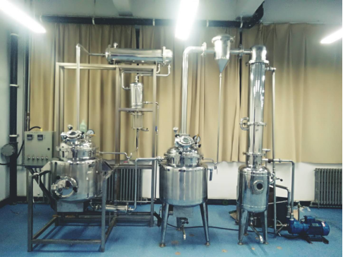 多功能提取浓缩回收机组设备组成包含不锈钢提取罐、列管式冷凝器、盘管式冷却器)、油水分离器(可回收物料中挥发性芳香油)、不锈钢浓缩罐、不锈钢管道过滤器、不锈钢水环式真空泵、欧姆龙温控仪、真空表、电加热器、电气控制柜、连接管道管件阀门等。